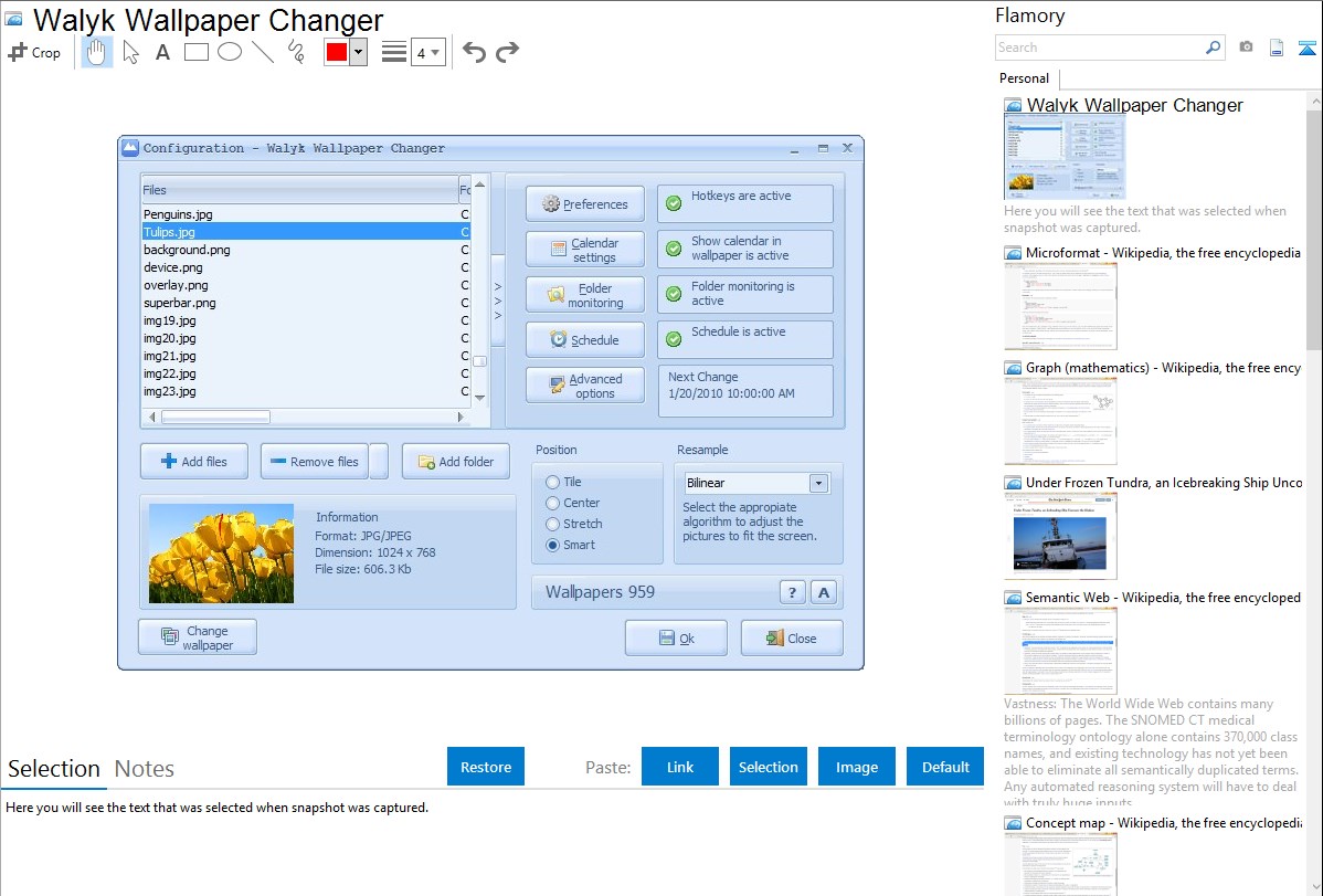 Flamory helps you capture and store screenshots from Walyk Wallpaper Changer by pressing a single hotkey. It will be saved to a history, so you can continue doing your tasks without interruptions. Later, you can edit the screenshot: crop, resize, add labels and highlights. After that, you can paste the screenshot into any other document or e-mail message.