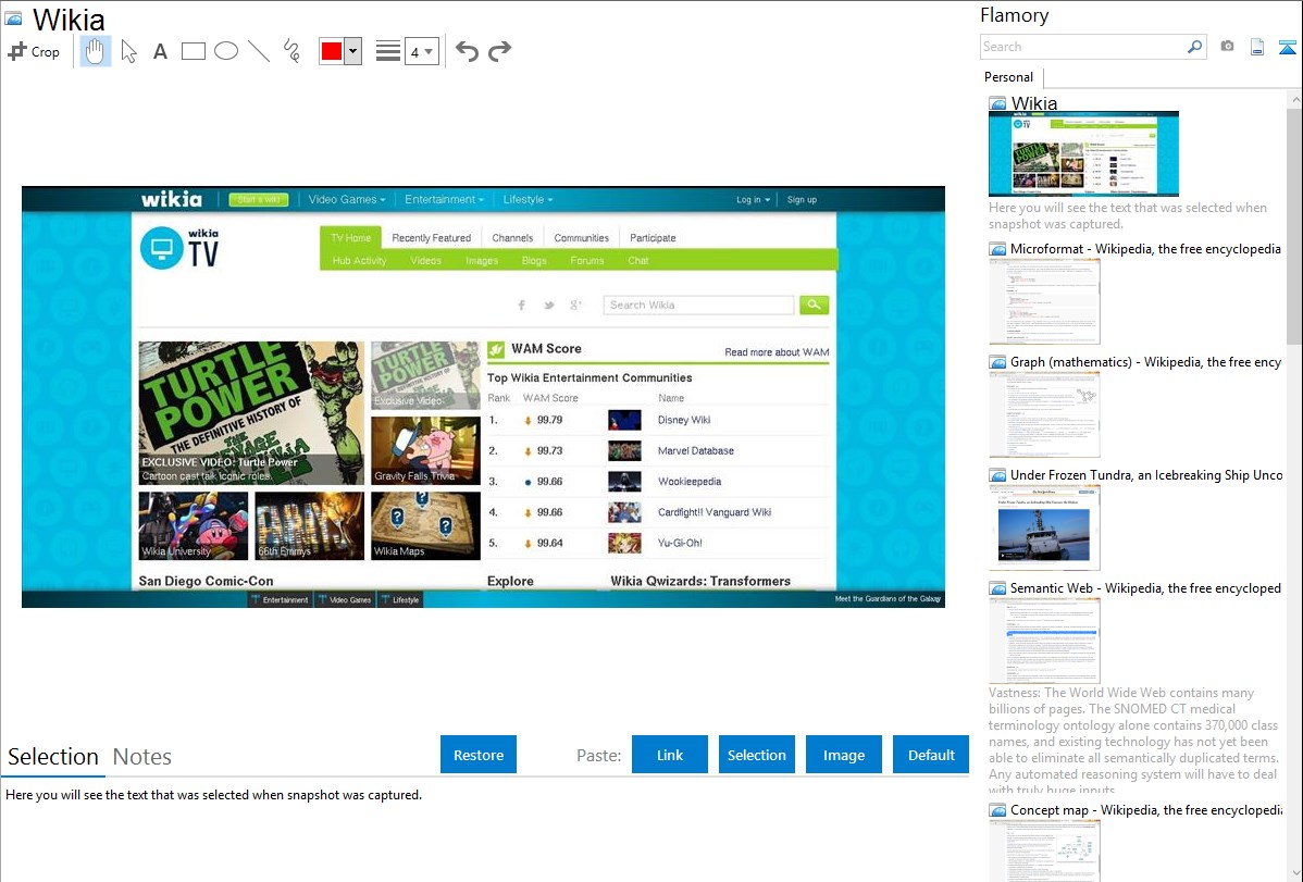 Flamory helps you capture and store screenshots from Wikia by pressing a single hotkey. It will be saved to a history, so you can continue doing your tasks without interruptions. Later, you can edit the screenshot: crop, resize, add labels and highlights. After that, you can paste the screenshot into any other document or e-mail message.