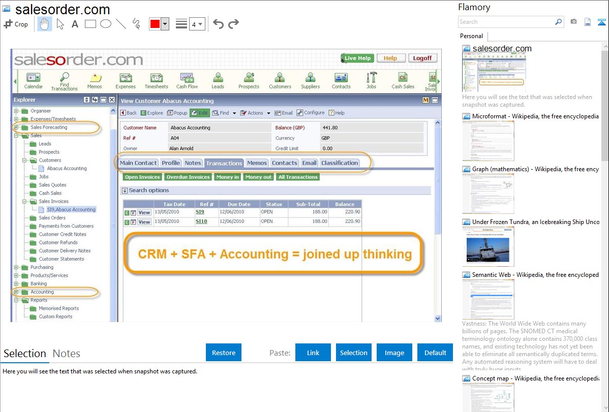 Flamory provides advanced bookmarking for salesorder.com. It captures screen, selection, text on the page and other context. You can find this bookmark later using search by page content or looking through thumbnail list.